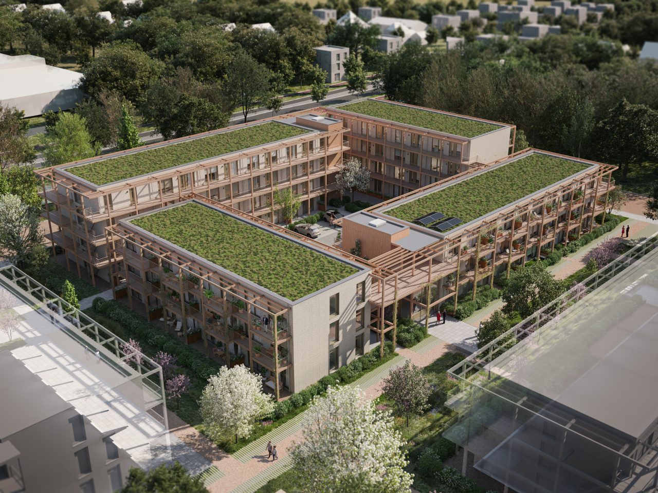 Vriendelijke woonblokken in het groen, natuurlijke materialen en doordachte buitenruimtes nodigen bewoners uit om elkaar te ontmoeten en verbinding te maken met de omgeving. Auto’s blijven buiten beeld – parkeren gebeurt binnen de bouwblokken en aan de randen van het gebied.